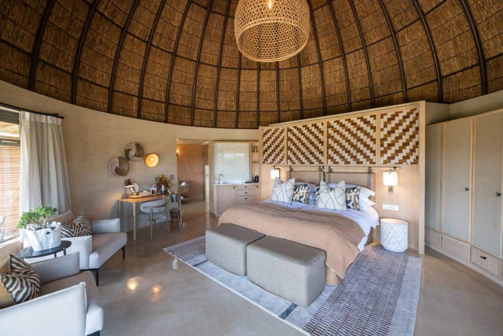 Die Unterkünfte sind vielfältig und bieten Platz für Paare, Familien und kleine Gruppen. Die ikonischen Kwena Lodge Suiten sind spektakulär in die Landschaft integriert und bieten einen 180-Grad-Panoramablick, Kamine, elegante Badezimmer und Sternenbeobachtung direkt von Ihrem Zimmer aus. Für Familien und Gäste, die mehr Privatsphäre suchen, empfehlen sich die Villen der Kwena Lodge oder der Lehele Lodge, die geräumige Wohnbereiche mit Ausblicken auf die Tierwelt des Reservats kombinieren. Für diejenigen, die ein abenteuerliches und nachhaltiges Erlebnis suchen, bietet Gondwana auch ein Öko-Camp mit luxuriösen, mit Solarenergie betriebenen Zelten, in denen Sie die Natur hautnah erleben können – ohne auf Komfort verzichten zu müssen.